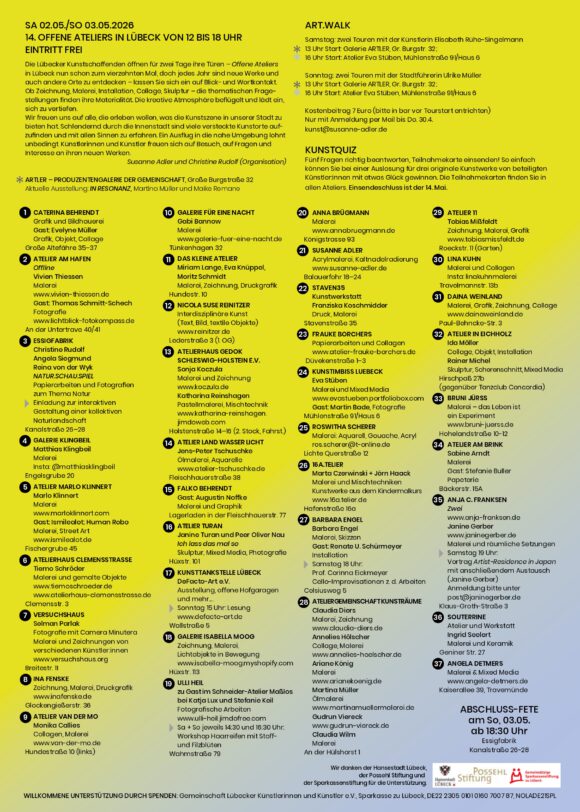 Treten Sie in Kontakt mit 62 Künstler:innen in 37 Ateliers in Lübeck und Umgebung.