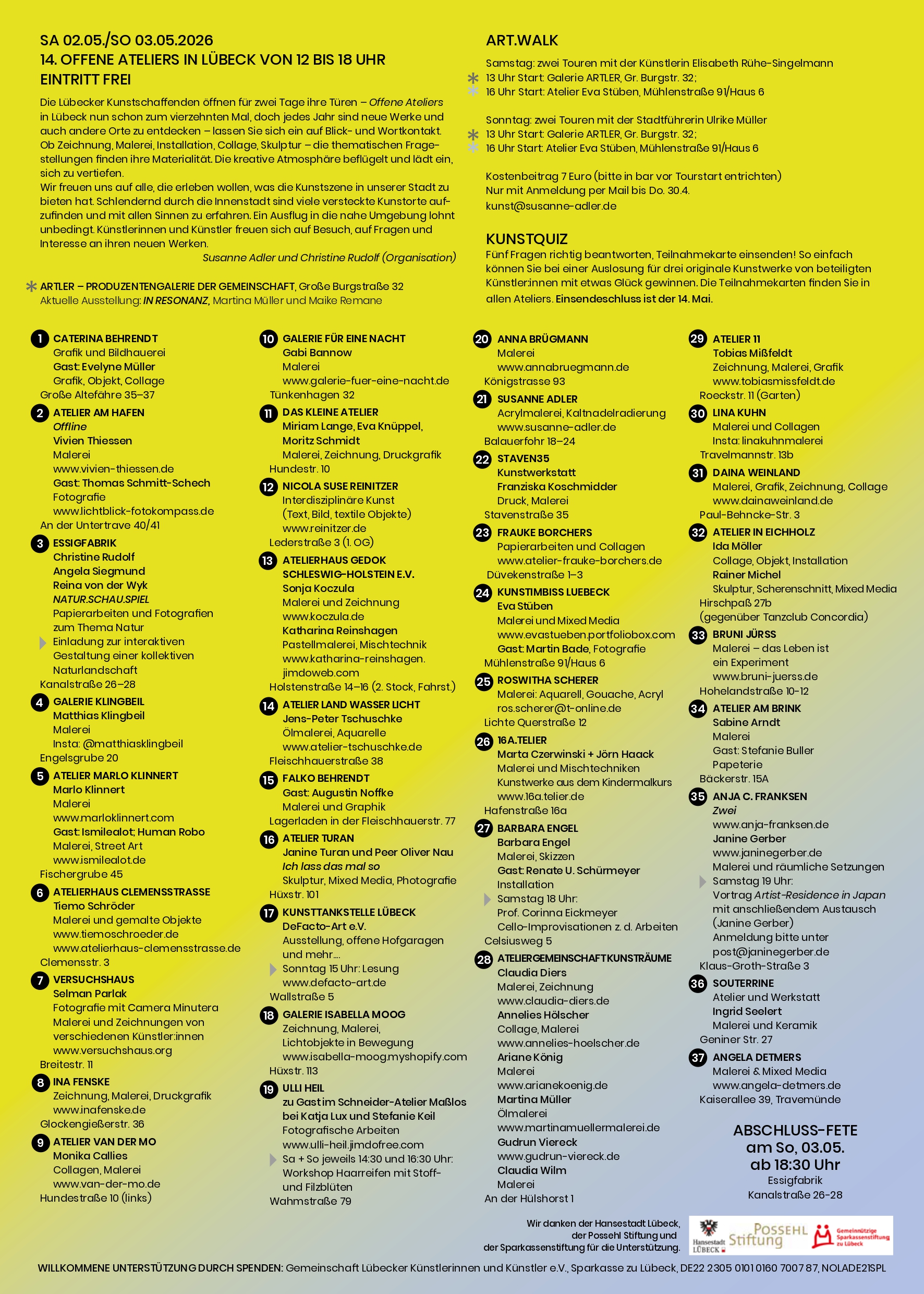 Treten Sie in Kontakt mit 62 Künstler:innen in 37 Ateliers in Lübeck und Umgebung.